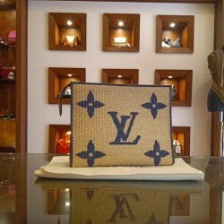 Pepper's Luxury Closet guarantees this is an authentic beige x Navy Raffia Monogram Clutch Pochette (New). Featuring premium materials and a timeless design, it is perfect for elevating your style for any occasion. This item has been carefully inspected by our experts to verify authenticity and condition.